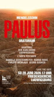 Am Sonntag, 28. Juni 2026, um 17 Uhr erklingt das monumentale Werk in der Friedenskirche Ludwigsburg. Die Kantorei der Karlshöhe musiziert gemeinsam mit dem Originalklangorchester L’arpa festante und einem hochkarätigen Solistenensemble: Daniela Gerstenmeyer (Sopran), Hanna Roos (Alt), Philipp Nicklaus (Tenor) und Georg Gädker (Bass).